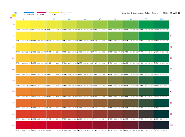 ●独自のカラーナンバー(SV-001〜1000)Standard Variation Color Chartに収録されている色数は1000色。全ての色コマの下部に、カラーナンバー(SV-001〜1000)を付記。Arrangement Color Chart(A)及び(B)にも、同じカラーナンバー(SV-001〜1000)を付記してある。つまり、総数30チャート、のべ3000の色コマには、同じ色が3コマずつ登場してくる。これらを関連付けるために、同じ掛け合わせの色には、同じカラーナンバーが付されており、それぞれが相互にINDEXの要素を備えている。