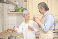 おしゃれなシニアカップルが仲良く寄り添うキッチン風景。単身者のあわただしい朝食や調理シーンなど、キッチンにひろがる笑顔のいろいろ。