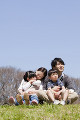 ある晴れた休日に家族みんなで朝食をとり公園でお散歩。子育てに熱心な若い夫婦と元気いっぱいな子供達の楽しそうな笑い声が聞こえてきそうなファミリーイメージです。