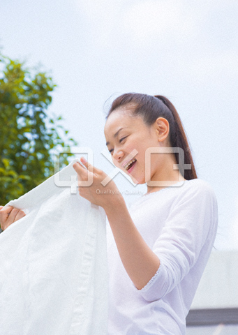 色見本のG&E > 素材集 > QxQ IMAGES(キューバイキューイメージズ) > QxQ IMAGES 032 Housework > 洗濯物を広げる女性 - QX032020.jpg