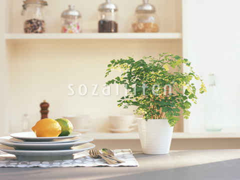 色見本のG&E > 素材集 > 素材辞典 > 素材辞典Vol.155 生活空間・インテリア小物編 > 食器とアジアンタムの鉢植え - GK158.jpg