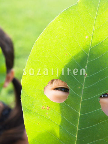 色見本のG&E > 素材集 > 素材辞典 > 素材辞典 Vol.195〈楽しいピクニック-ファミリー&フレンズ編〉 > 葉のお面で遊ぶ子供 - JB145.jpg