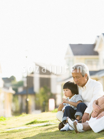 色見本のG&E > 素材集 > 素材辞典 > 素材辞典 Vol.201〈ファミリー-爽やか三世代編〉 > 芝生に座る祖父と孫 - JH034.jpg