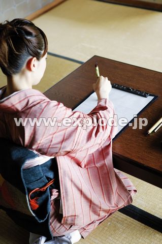 和服の女性モデルによる書道、華道など、伝統的な日本の人物イメージ