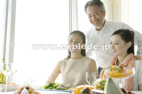 色見本のG&E > 素材集 > DAJ digital images > DAJ428 Senior 〜Hotel&Beach〜 > 料理を前にして笑顔の家族 - da-428033.jpg