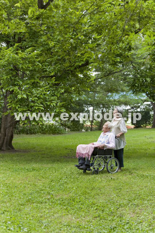 色見本のG&E > 素材集 > iconics > iconics 003 介護〈人物、日本〉 > シニア男性の乗った車いすを押すシニア女性 - IC003012.JPG