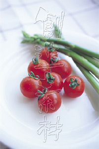 色見本のG&E > 素材集 > 創造素材 > 食シリーズ > 創造素材 食シリーズ [14] パン・サラダ・おかず > 皿の上のアスパラガスとプチトマト - F014090.jpg