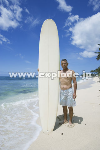 色見本のG&E > 素材集 > Image Werks RF > Image Werks RF 40 Senior Man in Hawaiian Style〈シニア マン イン ハワイアンスタイル〉 > サーフボードを持って海辺に立つシニア男性 - IWF044_021.JPG