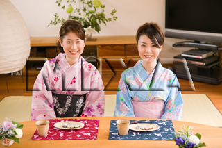 浴衣、訪問着でポーズをとる若い女性。モダンなハウススタジオで、現代的な きものライフを表現しました。